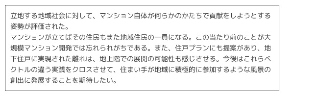 なお、今回の『ジオ杉並松庵』の受賞により、当社のマンションブランド〈ジオ〉におきまして、7年連続通算16案件の受賞となりました(昨年度は『ジオ京都御所北』『ジオ調布』で受賞)。