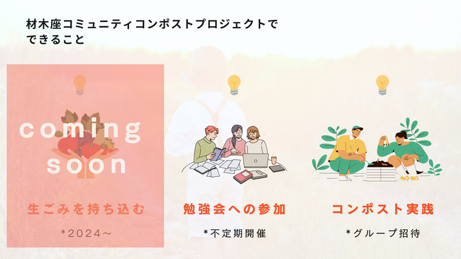 まずは小規模の「mimicom」から実験的にスタートし、コンポストサイズの拡張、さらには、パブリック アンド コーが管理する鎌倉市内のファームでの堆肥の活用、参加者に野菜やハーブなどの野菜を還元をする循環の形成を目指します。また、コンポストの学習機会やワークショップを提供することで、家庭だけではなくコミュニティで運営されるコンポストを地域に増やしていく予定です。