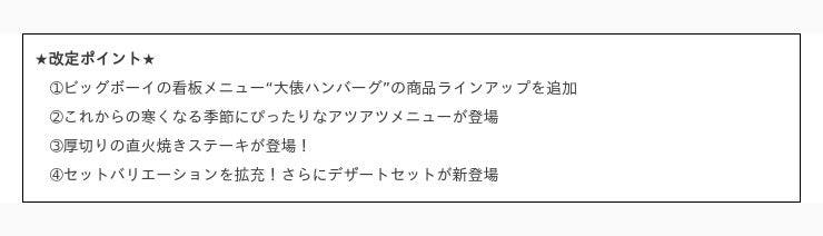 ぜひこの機会にお近くの「ビッグボーイ」「ヴィクトリアステーション」で、「秋冬グランドメニュー」をお楽しみください。