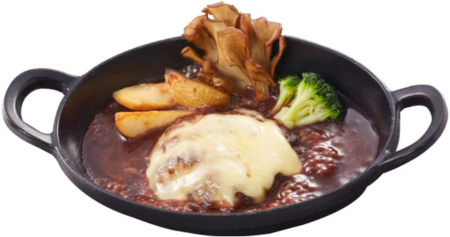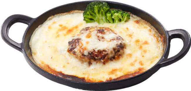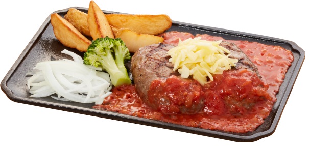 300℃以上の高温で香ばしく焼き上げた大俵ハンバーグに、たっぷりのトマトソースとチーズをあわせた商品です。