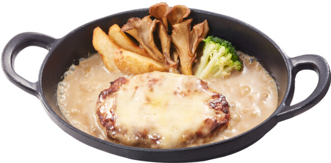 ふっくらジューシーに仕上げた“手ごね合挽きハンバーグ”に、ポルチーニやマッシュルーム、玉ねぎを使用したシャンピニオンクリームソースをあわせました。