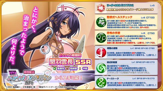 本日開始の「メディカルプリズンガチャVol.1」では、新たに「【ウワサの看護師】関羽雲長」(CV:生天目 仁美)」が登場。