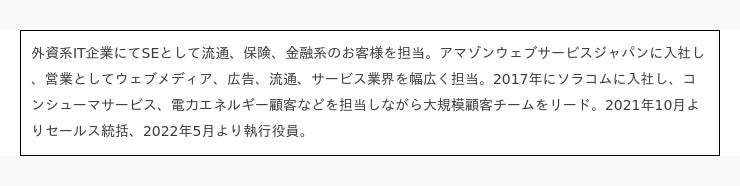 私自身、ITの分野で経験を積んできました。テクノロジーが持つ無限の可能性を信じ、社会に対して価値ある貢献をしていきたいと考えています。当社のサービスが、皆様の生活やビジネスの一部として、新しい価値を創出していけるようこれからも全力で支援させていただきます。