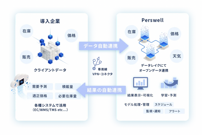 社内外のあらゆる形式のデータを扱いやすくする「AirLake(エアーレイク)」と、天候などの外部データも活用できる予測・最適化ソリューション「Perswell(パースウェル)」を組み合わせた当社のソリューションは、さまざまな業種のサプライチェーンマネジメントに活用可能です。