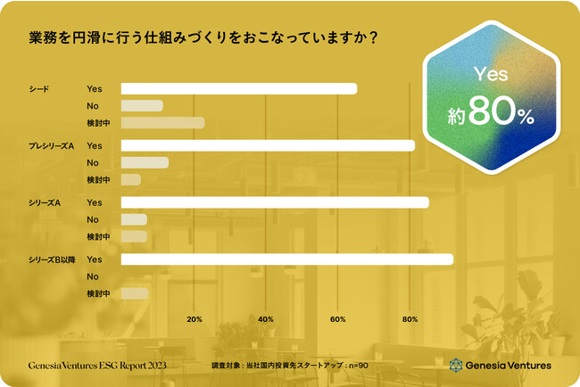 主な取組みとしては、2022年2月にESG投資方針( https://www.genesiaventures.com/esg-policy/ )を策定し、それに基づき独自のESGチェックリストを整備の上、投資検討時に重要課題を特定するプロセスを設けています。また、投資後には同課題に関する経営者との継続的な対話を行い、ESG経営を支援するためのサービス提供や啓蒙活動等を実践してきました。