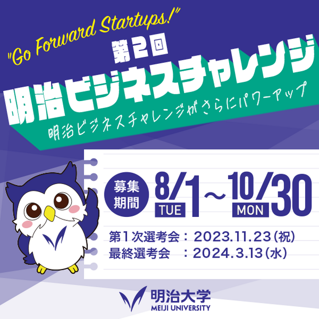 明治大学経営学部は、そうした明大生が「前へ!」挑戦し、明日の社会に向けて動き出す機会を提供することを目的に、今年度秋学期に第2回明治ビジネスチャレンジ(ビジネスコンテスト)を開催します。2回目となる今回は、最優秀賞副賞の賞金額を前回から2倍の100万円に設定しパワーアップさせました。