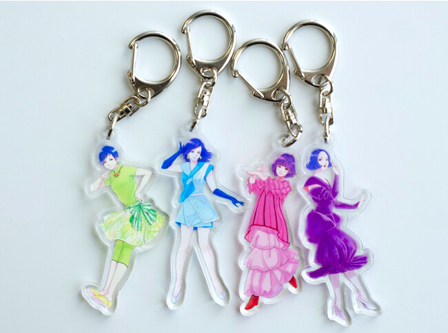 ひとりひとりの出演者イラストを施したアクリルキーホルダー。全4種が入ったガチャガチャによるランダムでの販売です。ぜひあなたの推しのキーホルダーを手に入れてください!