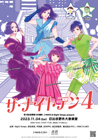 ラジオ局J-WAVE(81.3FM)は、DJ/音楽プロデューサーのNight Tempoとタッグを組み、野宮真貴、早見 優、松本伊代、渡辺満里奈の「4」人をゲストに迎えるスペシャルイベント「祝・日比谷野音100周年 J-WAVE & Night Tempo present ザ・ナイトテン4」を11月4日(土)に100周年を迎える日比谷野外音楽堂で開催いたします。