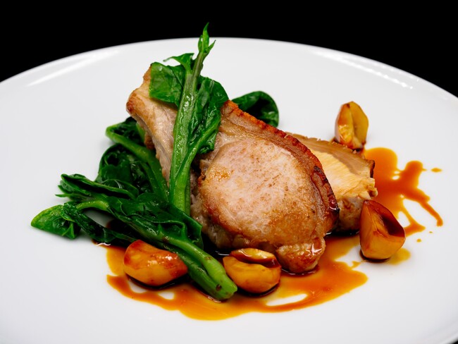 スペイン産の仔豚ロース肉をジューシーに焼き上げ、栗を使用したガストリックソースで仕上げました。