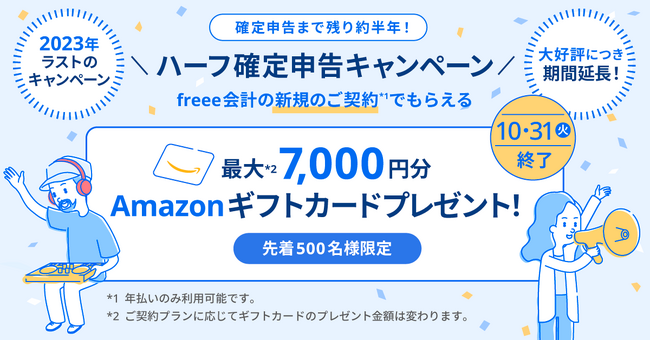 freee株式会社(本社:東京都品川区、CEO:佐々木大輔、以下「freee」)は、確定申告を応援するキャンペーン「ハーフ確定申告キャンペーン」の開催を10月31日(火)まで延長することをお知らせします。