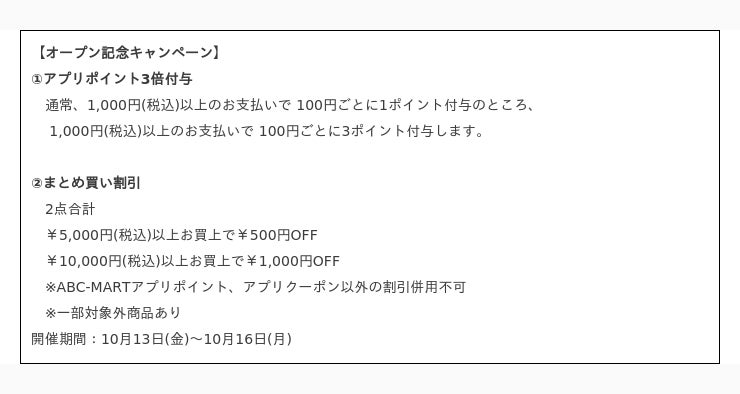 オープンを記念して、「ABC-MART アピタ長津田店」にて10月13日(金)よりお買い物をおトクに楽しめるキャンペーンも開催します。