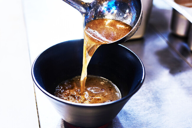 看板商品である焼きあご醤油ラーメンのスープをベースに何種類も麺を試しました。今使っているは村上朝日製麺所というラーメン好きに注目されている製麺所から直送してもらっています。