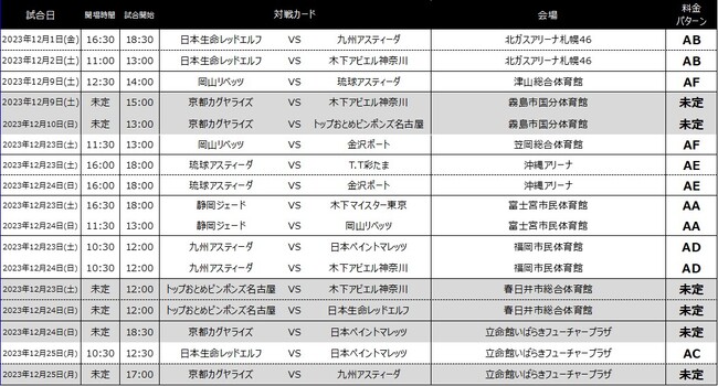 12/25 日本生命 vs ニッペM 13:00試合開始 ➾ 12:30試合開始、 12/25 京都 vs 九州 16:30試合開始 ➾ 17:00
