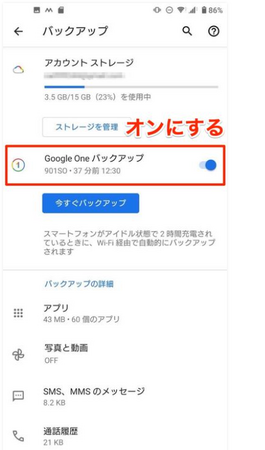 Step2.Googleアカウントのメニューからバックアップを選択します。「Google Oneへのバックアップ」ををオンにする。