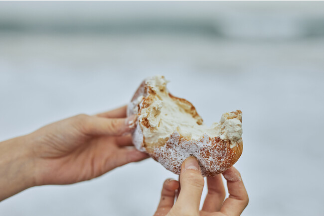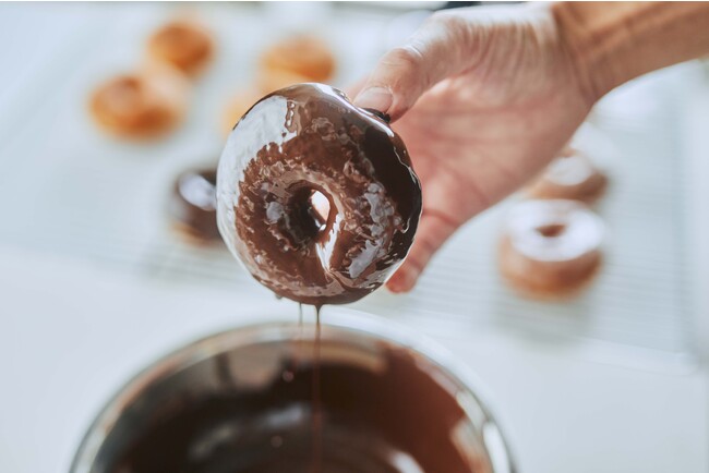 オイル、生地、クリームに、チョコレート、どれも植物性の100%ヴィーガンドーナツ。シンプルながらこだわりの素材を使用し、ヴィーガンとは思えない豊かな味わいを表現しました。シグニチャーとなるチョコレートドーナツは、コロンビアに構える自社管理農園のカカオから作る、香り高いビターチョコレートを使用しています。生地の発酵を見極め、揚げ方を追求することで、軽くてもっちり、食べ応えのあるドーナツに仕上げました。