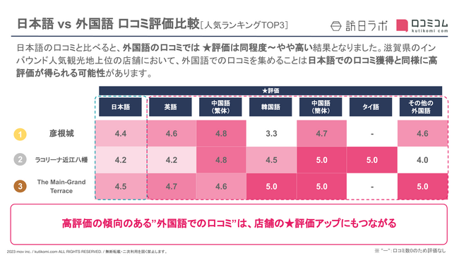 日本語の口コミと比べると、外国語での口コミでは、★評価は同程度~やや高い結果となりました。滋賀県のインバウンド人気観光地上位の店舗において、外国語での口コミを集めることは日本語での口コミ獲得と同様に高評価が得られる可能性があります。