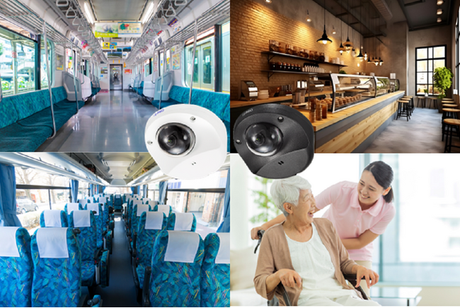 薄さ53 mmのコンパクトな筐体で、環境調和に適したブラックモデル、高解像度4MPモデル、車載モデルをラインアップします。車載モデルは、複数の鉄道・車載用規格に準拠しており、鉄道や自動車における振動や衝撃に耐えうるよう設計されています。これにより、従来モデルでは難しかった鉄道や自動車への設置が可能となり、昨今求められる鉄道車両やバス車内の安心・安全な環境作りに貢献します。