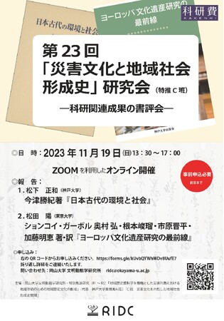 国立大学法人岡山大学(本部:岡山市北区、学長:那須保友)文明動態学研究所(RIDC)では、第23回「災害文化と地域社会形成史」研究会-科研関連成果の書評会-を、2023年11月19日(日)13:30~17:00にオンラインで開催します。