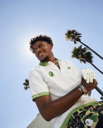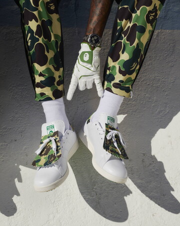 原宿の街中でもゴルフ場でも活躍する BAPE(R) Stan Smith Golf には、着脱可能な ABC CAMO キルティ シューレースカバーと同系色のヒールマスターシュ、ゴルフに必要なグリップ力を備えたグリーンのアウトソール、そして特製 BAPE(R) ゴルフ グラフィックを施したソックライナーを搭載。さらには交換可能なシューレース 3 セット付き。