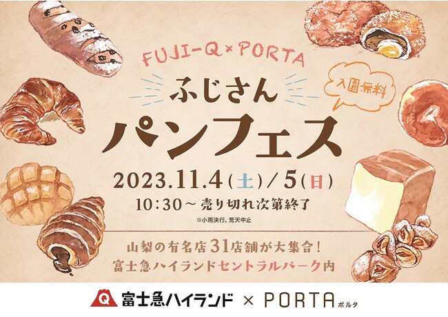 入園無料の富士急ハイランド(山梨県富士吉田市)では、山梨県内の有名ベーカリーやお菓子屋さんが大集合する「ふじさんパンフェス2023」を、2023年11月4日(土)・5日(日)に開催いたします。