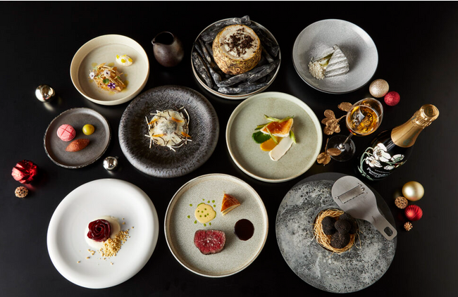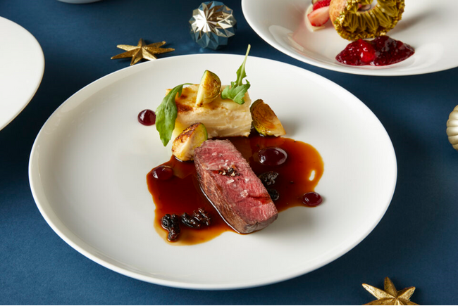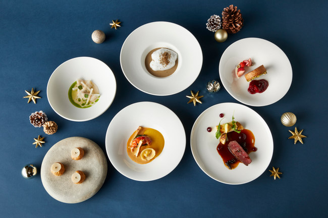 ディナーコースには、旬を迎えるズワイガニを根セロリで包んだ「ズワイガニのラビオリ トリュフ 金柑 コンテチーズ」をはじめ、神奈川近海の鮮魚を特注のグリル台で絶妙な加減に火入れした「アカハタのグリル ロメインレタス シャルトリューズ 燻製ヨーグルト」、「横濱ビーフサーロイン トリュフとポテトのトゥルト 赤ワインソース」など、ホリデーシーズンを彩る贅沢なメニューを全6品のフルコースにてご提供いたします。ディナーコースはペリエ ジュエ ベル エポックのボトル付きプランやソムリエが厳選したワインペアリングもお選びいただけます。ランチタイムにはメインディッシュを選べる4品のコースをご用意いたします。