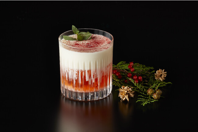 今年のクリスマスカクテルは甘酸っぱいいちごのティラミスを思わせる、贅沢な一杯「ストロベリーティラミス」をご用意いたします。2層のカクテルは、下には凝縮された旬のあまおういちご、上にはマスカルポーネクリームのエスプーマを乗せ、自家製あまおういちごのドライパウダーをかけてなめらかな口当たりに仕上げました。特別な一夜にふさわしい至高の一杯です。