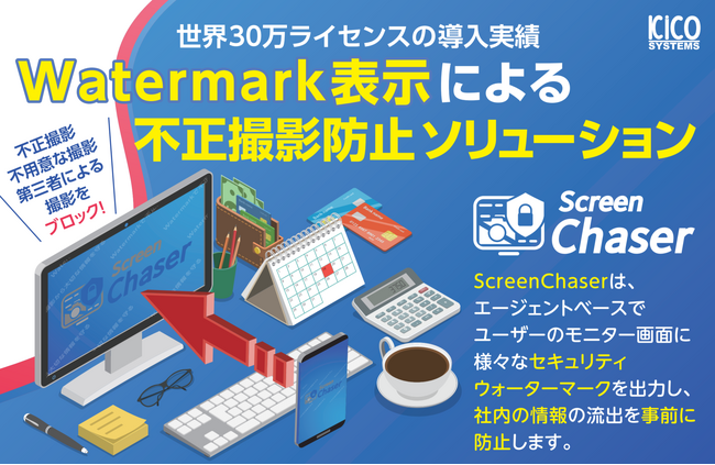 株式会社KICOシステムズ(本社:東京都千代田区)は2023年10月より、PCモニター不正撮影防止ソリューション「ScreenChaser」にオプション機能として目に見えない透かし「InvisibleWatermark」を追加実装し提供を開始しました。