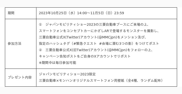 ブース内のライドシアターには「モンスターハンター」シリーズでも人気のモンスターが登場するほか、三菱自動車ブースでスマートフォンをコンセプトカーや展示車にかざすと、モンスターが登場し、車とともに撮影することができます。加えて、X(旧Twitter)キャンペーンを10月25日(水)~11月5日(日)の期間で実施します。モンスターと車両を撮影した画像にハッシュタグ(#緊急クエスト #会場に潜む3つの影)をつけてポスト、または三菱自動車公式X(@MMCjpn)をフォローの上、キャンペーン告知ポストをご自身のXでリポストしたすべての方を対象に、ジャパンモビリティショー2023限定の三菱自動車×モンハンオリジナルスマートフォン用壁紙(全4種類)をプレゼントするキャンペーンを実施します。