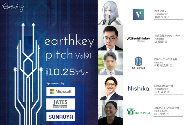 株式会社アースキー(本社:東京都品川区、代表:林 晋之介)は、10月25日(水)15時50分より厳選スタートアップ企業登壇のオンラインピッチイベント「earthkey pitch」を開催いたします。今回で91回目を迎えます。弊社独自基準で、選び抜かれたスタートアップ企業5社に登壇いただきます。