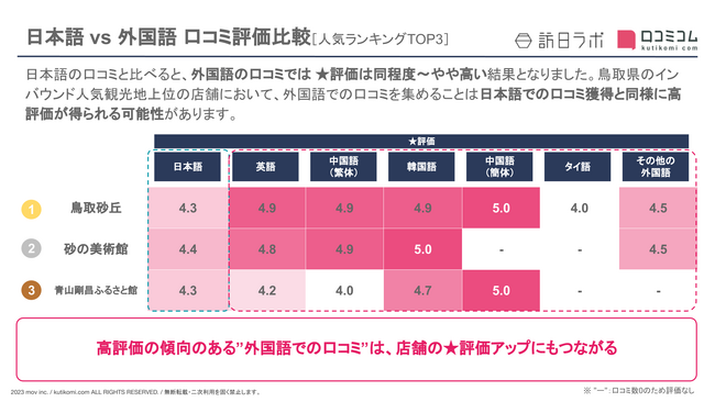 日本語の口コミと比べると、英語や中国語での口コミでは、★評価は同程度~やや高い結果となりました。鳥取県のインバウンド人気観光地上位の店舗において、外国語での口コミを集めることは日本語での口コミ獲得と同様に高評価が得られる可能性があります。