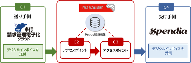 ※図中のC1~C4:Peppolの仕組みは「4コーナーモデル」と呼ばれるアーキテクチャを採用。C1(売り手側),C2(売り手側のアクセスポイント),C3(買い手側のアクセスポイント),C4(買い手側)を指す。