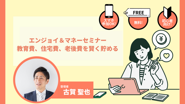 当日は、ライフプラン設計、資産形成・老後の年金対策、家計・固定費の見直しなどを専門分野とし、心と向き合うマイライフプランの作成のお手伝いをしている講師の古賀 聖也様を迎えて「エンジョイ&マネーセミナー 教育費、住宅費、老後費を賢く貯める」に関するオンラインセミナーを実施いたしました。
