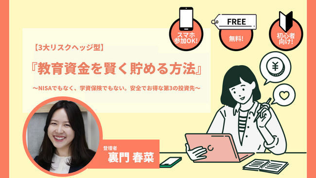 当日は、資産形成(NISA・iDeCo・株式など)、不動産(実需、投資用)、生命保険、医療保険、がん保険、女性疾病、を専門分野として活動している、講師の裏門 春菜様を迎えて「教育資金を賢く貯める方法」に関するオンラインセミナーを実施いたしました。