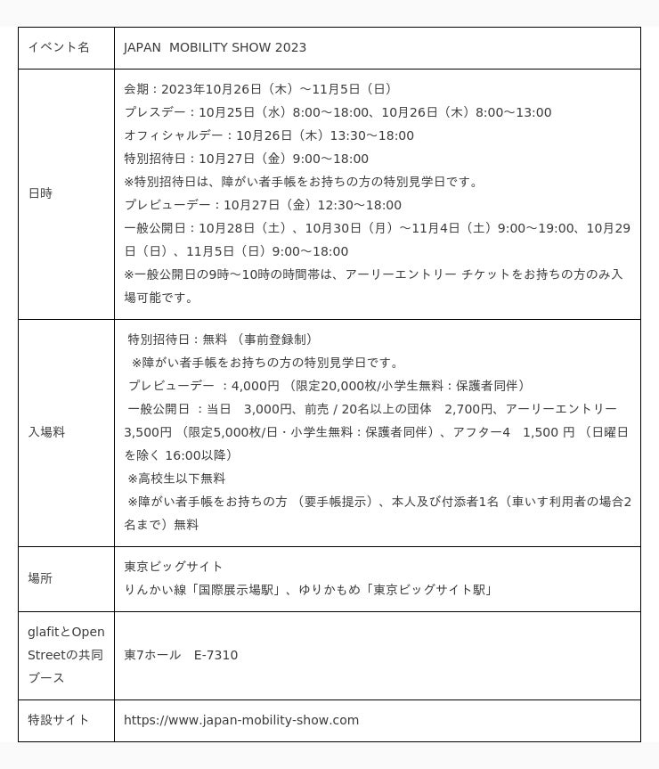 glafitとOpenStreetの共同ブース(東7ホールE-7310)において、JAPAN MOBILITY SHOW 2023初出展の経緯と電動サイクルの展開についてglafit代表 鳴海 禎造と、OpenStreet代表 工藤 智彰がお話しさせていただきます。引き続きその場で囲み取材を行います。