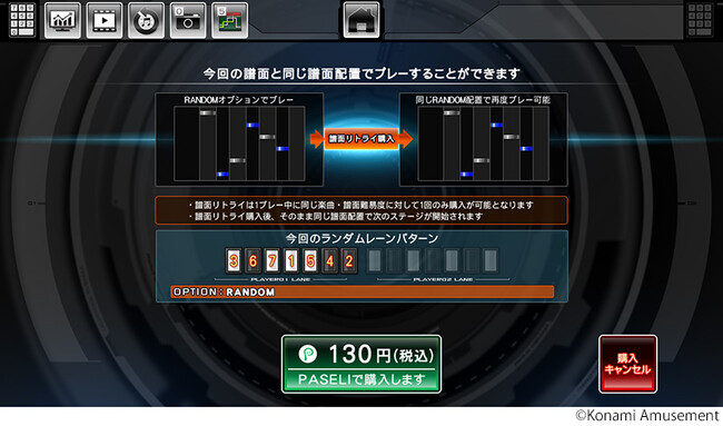 追加料金※を支払うことで同じランダム配置の譜面をもう1度プレーすることができる「譜面リトライ機能」を追加しました。