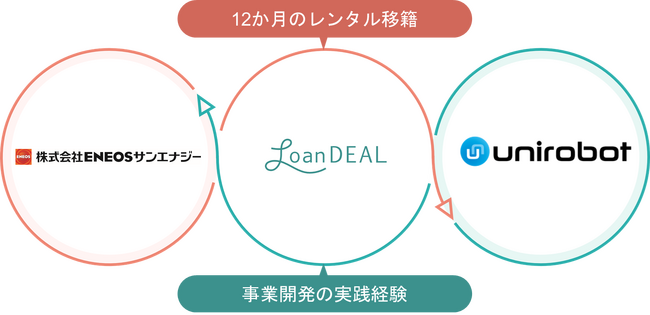 企業間レンタル移籍プラットフォーム「LoanDEAL」を提供。「レンタル移籍」は、研修・出向などの企業間契約に基づいて、イノベーション人材・次世代リーダー育成に取り組む大企業と、事業開発力を強化したいベンチャー企業のマッチングによって実現します。