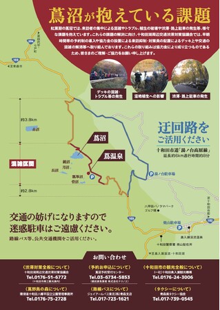 紅葉期の蔦沼では、来訪者の集中による混雑やトラブル、植生への負荷や渋滞・路上駐車の発生等、様々な課題を抱えています。