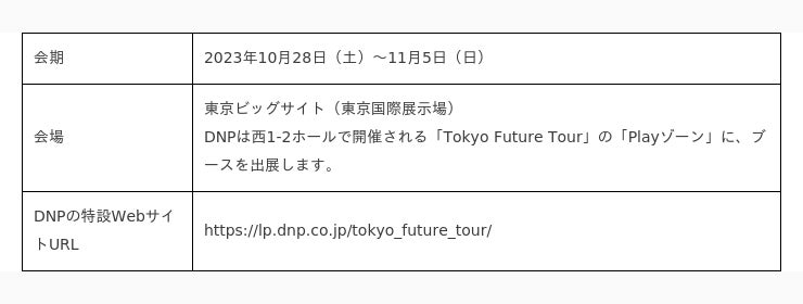 大日本印刷株式会社(DNP)は、2023年10月28日(土)~11月5日(日)に東京ビッグサイトで開催される「Japan Mobility Show 2023」(一般社団法人日本自動車工業会主催、旧:東京モーターショー)の主催者プログラム「Tokyo Future Tour」に協賛・出展します。