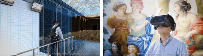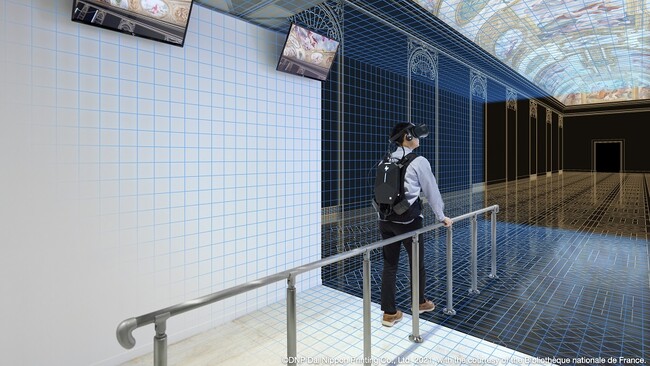 フランス国立図書館(BnF)のリシュリュー館の象徴的な空間であるマザラン・ギャラリーを360度見回せるVR空間で、利用者は現地を実際に訪れたような体験ができます。利用者本人がヘッドマウントディスプレーを着けて手すりを伝って6mほど歩くことで、VR空間内では長さ約45mの広大な回廊を移動しながら、約9mの高さにある17世紀の天井画を間近に見ることができます。