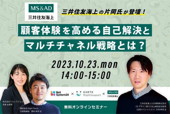 株式会社ベルシステム24(本社:東京都港区、代表取締役 社長執行役員:野田 俊介、以下:当社)は、「三井住友海上の片岡氏が登壇!顧客体験を高める自己解決とマルチチャネル戦略とは?」と題したオンラインセミナー(以下:本セミナー)を、10月23日(月)に開催します。