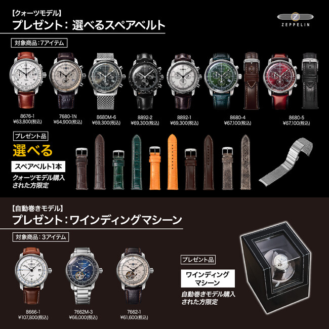 もらえるプレゼントは、商品ごとに分かれます。機械式時計の対象モデル(8666-1/7662-1/7662M-3)をご購入の方に、腕時計を巻き上げるワインディングマシーン、クオーツ対象モデル(8676-1/7680-1N/8680M-6/8892-1/8892-2/8680-4/8680-5)を購入の方に、スペアベルトをプレゼントします。