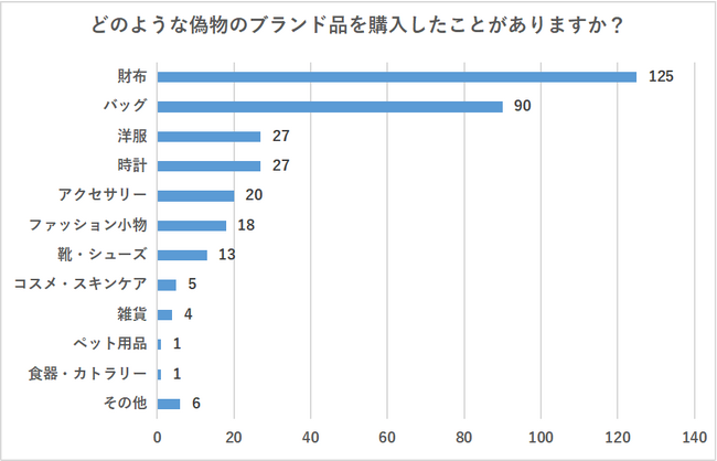 偽物ブランドの購入経験がある方に「どのような偽物のブランド品を購入したことがありますか?」と質問したところ、財布が最も多い票数を集めました。