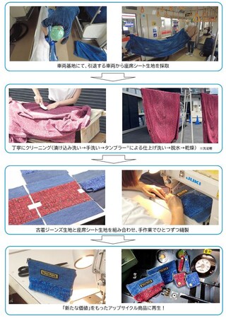 このなかで着目したのが「座席シート生地」です。耐久性に優れた座席シート生地を採用することで、頑丈でしっかりとした商品として活用できるのではないかと考え、このたび新たに、古着ジーンズ生地を活用したアップサイクル事業を展開する株式会社ヤマサワプレス(本社:東京都足立区、代表取締役:山澤 亮治、以下「ヤマサワプレス」)と共創し、座席シート生地と古着ジーンズ生地を組み合わせたアップサイクル商品として企画・開発しました。