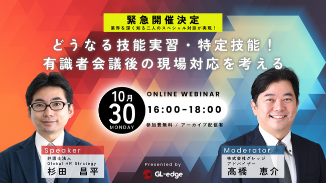 これを受けて、外国人雇用に特化し数々の団体に対して顧問として活躍している杉田昌平弁護士と厚生労働省等のセミナーに度々登壇をし、現場目線での外国人雇用の適正化を唱えている高橋恵介氏とのウェビナーを2023年10月30日に開催します。