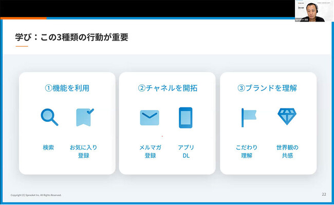 「ロイヤルティ要因分析」により、顧客育成にとって大事な3つの行動があることがわかりました。1つ目は「機能の利用」。サイトの便利な機能の利用を促進することで、リピート率が高まる傾向にあります。次に、「チャネルの開拓」。多様な顧客接点でコミュニケーションを取れるようにすることです。そして、「ブランドの理解」です。奥まったところにあって見つけづらいブランドの世界観を訴求するコンテンツを適切なタイミングで案内することで購買率を高められます。