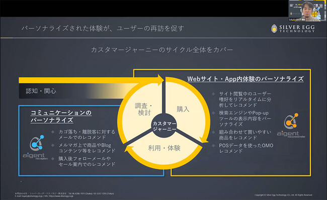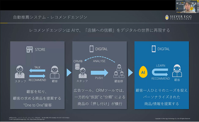 シルバーエッグ・テクノロジーは、カスタマージャーニーに応じたレコメンドを通じて顧客に気づきを与えるレコメンドエンジンの会社です。レコメンドとは、お客様に信頼してもらえるさまざまな情報を提案し、エンゲージメントとセールスの好循環を生み出すものだと定義しています。