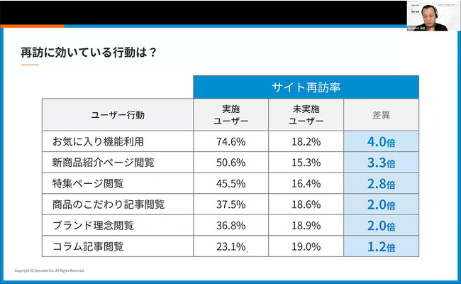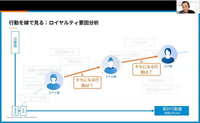 Sprocketには、どういう過程で顧客ロイヤルティが高まっているのかを可視化する「ロイヤルティ要因分析」というものがあります。行動を取った人と取らなかった人の違いを見ることで貢献度の高い行動をあぶり出し、リピート化のキモになる行動が見えてきます。
