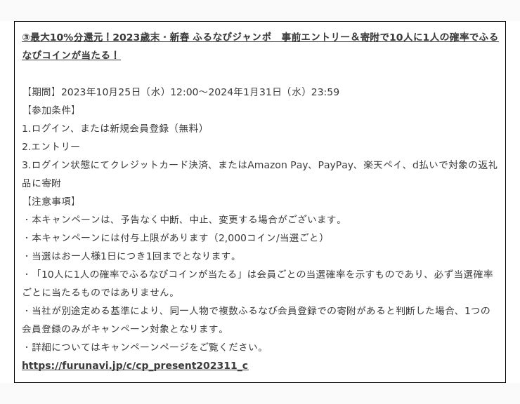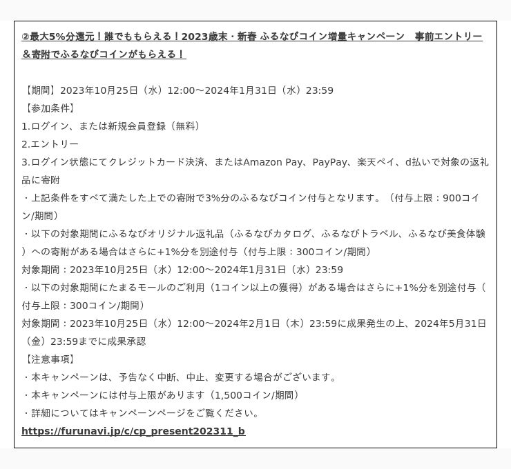 最大30%分還元!2023歳末・新春 ふるなびメガ還元祭 3つのキャンペーンに事前エントリー&寄附でふるなびコインがもらえる!概要