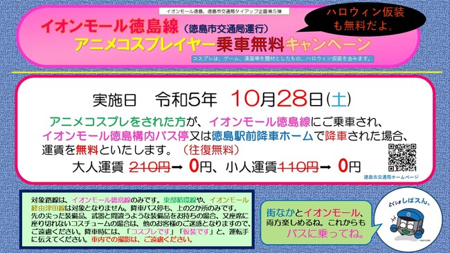 アニメコスプレまたはハロウィンの仮装をして、イオンモール徳島線に乗車され、「イオンモール徳島構内バス停」または「徳島駅前乗車ホーム」で降車された場合、運賃が無料になるキャンペーンを実施します。