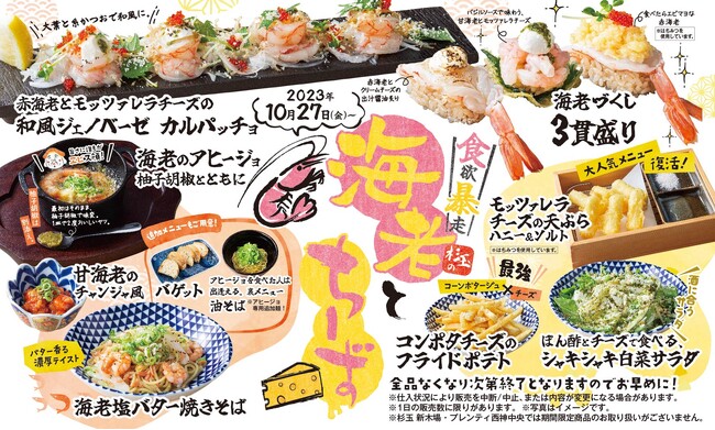 株式会社FOOD & LIFE INNOVATIONS(本社:東京都千代田区、代表取締役社長:堀江 陽)は「鮨 酒 肴 杉玉」にて10月27日(金)より、海老とチーズをお寿司やカルパッチョ、天ぷらなどで楽しめる期間限定商品を販売いたします。